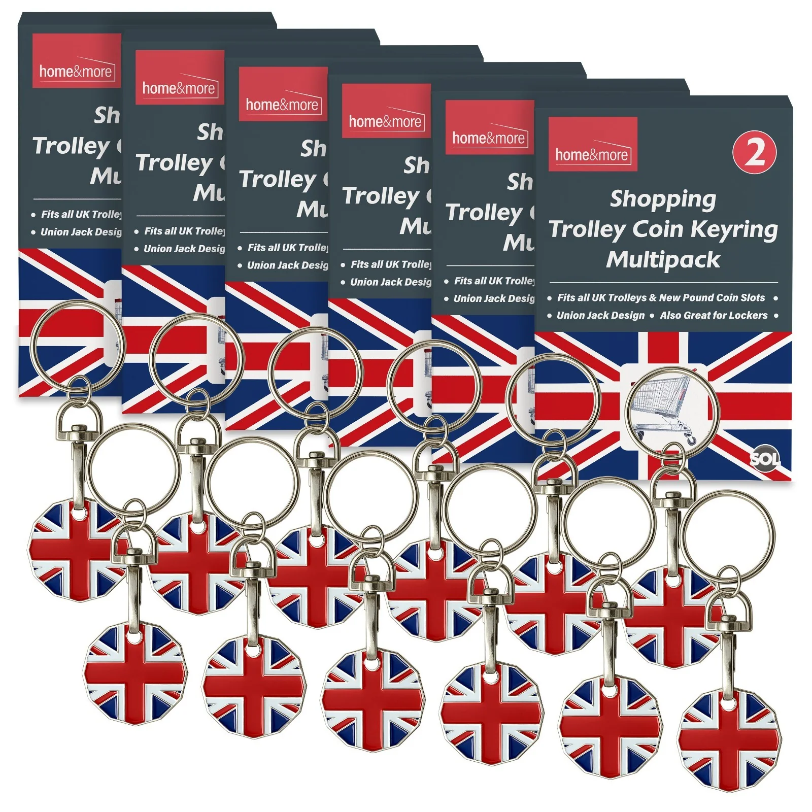 Never worry about loose change for your supermarket trips again with this 6-piece set of Union Jack shopping trolley token UK coins. Each trolly coin keyring UK is crafted from high-quality alloy, designed to mimic the 12-sided shape of the new £1 coin, ensuring compatibility with most modern UK supermarket trolleys.